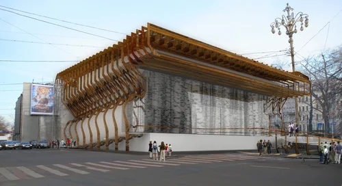 Branching Out sets out to transform the tree lined context of the Pushkinsky Cinema into an interwoven structural façade system in hopes of reactivating the site as a critical hinge between culture and nature within the city. Addressing the historic location of the project as part of the thriving boulevard greenbelt, the proposal attempts to return the site back to its natural context through a trifold strategy.
