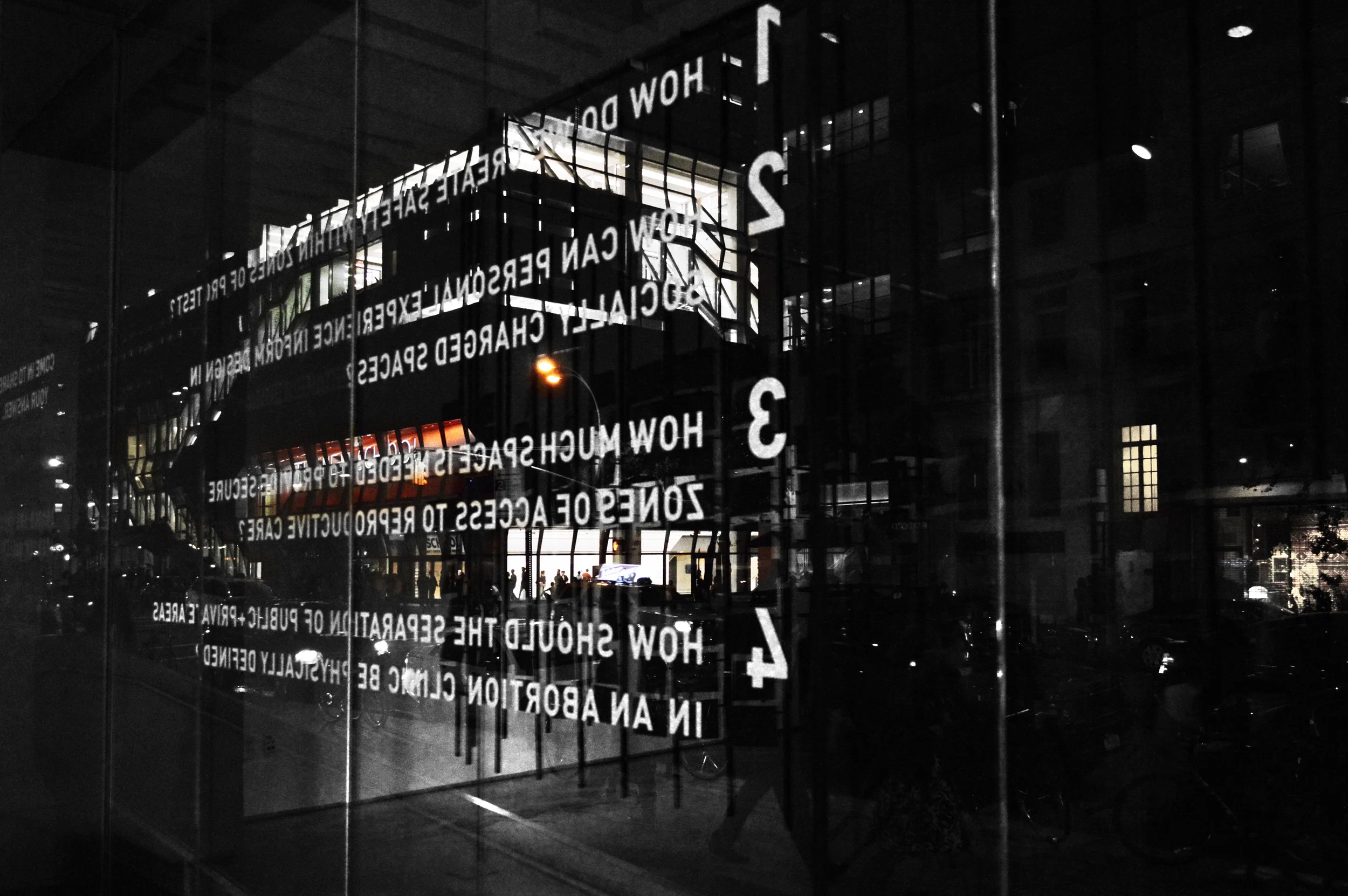 The installation comprised a curtain track suspending 594 postcards rotated on 66 dowels. Creating a private space within the public realm of the gallery, each postcard contained a story, message, call for action, or graphic responding to a series of prompts regarding the role of design in providing safe access to reproductive care.